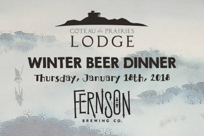 On January 18th, 2018, we hosted Fernson Brewing Company at our Winter Beer Dinner! Fernson Co-founder Derek Fernholz introduced his beers. Returning Guest Chef Jeff Anderson from Blue Plate Restaurant Co. prepared and introduced a five course pairing menu, which was incredible! We have hosted 12 beer dinners at Coteau des Prairies Lodge, each time…